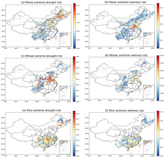 Spatial distributions of extreme drought and extreme wetness risks for major crops in China ((a) maize extreme drought risk; (b) maize extreme wetness risk; (c) wheat extreme drought risk; (d) wheat extreme wetness risk; (e) rice extreme drought risk; (f) rice extreme wetness risk).