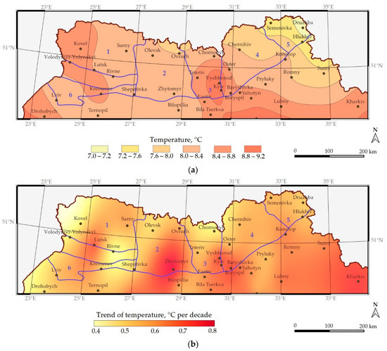 The spatial distributions for average annual surface air temperature (a) and corresponding trends (b) for Ukrainian Polissia regions for the period 1990–2021 (1–6 are geographical subzones as presented in Figure 1).