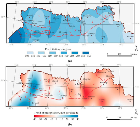 The spatial distributions for average annual amount of precipitation (a) and corresponding trends (b) for Ukrainian Polissia regions for the period 1990–2021 (1–6 are geographical subzones as presented in Figure 1).