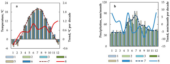 Seasonal variations in air temperature (a) and precipitation (b) in the Ukrainian Polissia for the 1990–2021 period. For 1–6—geographical subzones as presented in Figure 1; for 7—averaged for the Ukrainian Polissia; for 8—trend (scale on the right).