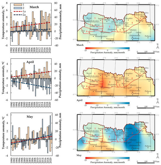 Anomalies in average monthly temperature (1, 1a—trend) and precipitation (2, 2a—trend) during the spring months (March, April, and May) (on left) and spatial distributions for the precipitation anomalies (on right), for the Ukrainian Polissia (1–6 are geographical subzones as presented in Figure 1) for the period 1990–2021. Anomalies were calculated from the climatic norm values for the period 1961–1990.