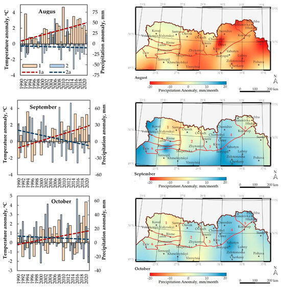 Anomalies in average monthly temperature (1, 1a—trend) and precipitation (2, 2a—trend) during August, September, and October (on left) and spatial distributions for the precipitation anomalies (on right), for the Ukrainian Polissia (1–6 are geographical subzones as presented in Figure 1) for the period 1990–2021. Anomalies were calculated from the climatic norm values for the period 1961–1990.