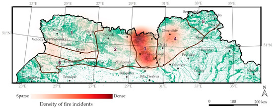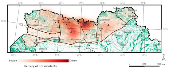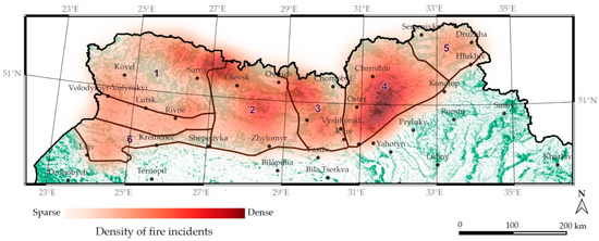 The spatial distribution of wildfire incident density according to satellite data (FIRMS, [86,87]) in the regions of the Ukrainian Polissia for the period 2001–2023 (1–6 are geographical subzones as presented in Figure 1).