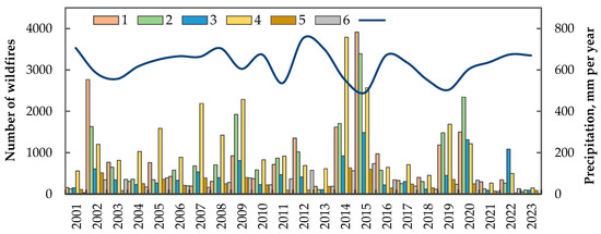 Comparison of the number of wildfires (scale on the left) and annual precipitation (scale on the right) in the Ukrainian Polissia region from 2001 to 2023 (1–6—geographical subzones as presented in Figure 1, blue line—averaged annual precipitation).