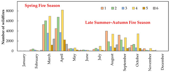 Seasonal variation in the number of wildfires in the Ukrainian Polissia region from 2001 to 2023 (1–6—geographical subzones as presented in Figure 1).