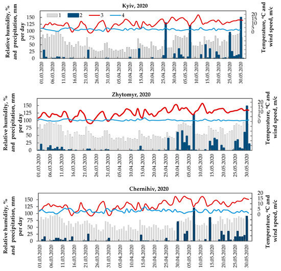 Figure 10 presents the time series data for the daily relative humidity, precipitation, surface air temperature, and wind speed at weather stations in Kyiv, Zhytomyr, and Chernihiv for the period from March to May 2020; the data demonstrate anomalous weather conditions.