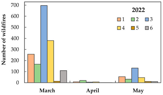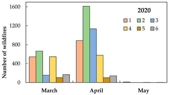Thus, a snowless warm winter, a warm and dry spring (in March and April), and stormy winds with speeds of 15–20 m/s were the weather factors that contributed to the development of forest fires in most of the territories of the Ukrainian Polissia. The greatest spread of wildfire was observed in Volyn Polissia, Zhytomyr Polissia, Kyiv Polissia, and Chernihiv Polissia in March and April. The cooling temperatures and rain in May did not contribute to the spread of fires. The number of wildfires in the Ukrainian Polissia in March–May 2020 was determined using satellite data [86] (Figure 11).