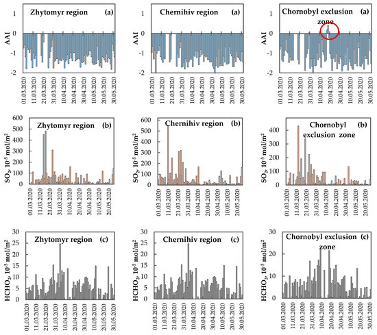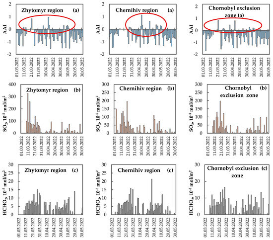 Satellite observations of atmospheric concentrations associated with the Absorbing Aerosol Index, in addition to concentrations of sulfur dioxide and formaldehyde (HCHO), were analyzed for the vertical column over the Zhytomyr Polissia and Chernihiv Polissia regions, as well as the Chornobyl Exclusion Zone, during March–May of 2020 and 2022, using data from the Sentinel–5P satellite (see Table 2). The study utilized the freely available Google Earth Engine platform [87,88] and QGIS software for data processing and analysis. The Absorbing Aerosol Index (AAI), also known as the UV Aerosol Index, is a measurement derived from satellite observations [89,90]. It provides information about the presence and intensity of UV-absorbing aerosols in the atmosphere. Positive values for the AAI typically indicate pollution from combustion products, making it useful for tracking events such as dust outbreaks, volcanic ash emissions, and biomass burning. Negative values, on the other hand, suggest the absence or minimal presence of UV-absorbing aerosols. This index can be calculated even in the presence of clouds, enabling continuous monitoring of aerosol events.