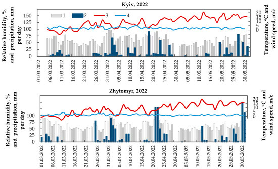 - Daily data for relative humidity, precipitation, surface air temperature, and wind speed from the Kyiv, Zhytomyr, and Chernihiv weather stations, from March to May of 2020 and 2022 (source: [79]).