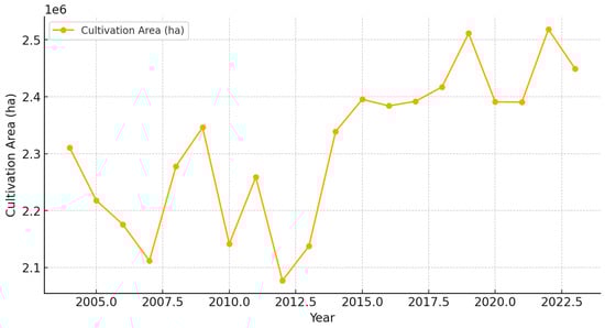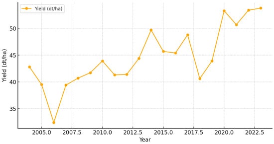 Wheat area cultivation during the first decade, from 2004 to 2013, showed a relatively stable position of the cultivated area, ranging from approximately 2.1 million to 2.3 million hectares. However, there were also fluctuations, likely because of bad weather conditions, changes in agricultural policy, or variability in the profitability of wheat farming in specific years. In the second decade, 2014–2023, the growth became more pronounced and reached a historical height of 2.52 million hectares in 2022. Such a trend could be explained by EU support, improved efficiency in agricultural land management, and a growing demand for wheat both at the domestic and international levels. However, such a decline in 2023 would likely indicate that there are some challenges, such as climate change; thus, a closer look may be warranted.
