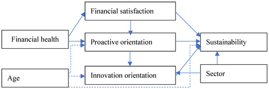 Figure 2 shows the research model of this study. The proposed model describes the relationships between financial health, innovation, and proactive business practices; the Romanian companies’ specific characteristics and management perception; and the ecological performance and attitudes toward sustainability.