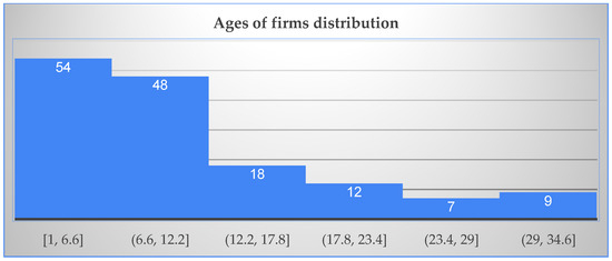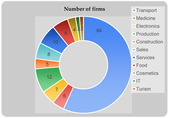 After obtaining the data on the “green performance” and “financial performance” of the companies included in the study, we can perform their analysis: examination of the distribution of companies across different fields, an evaluation of the average number of employees, and the investigation of age of companies in the sample.