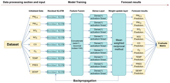 24]. In this study, multiple NLSTMs were connected through residual connections, allowing information to be directly transmitted between different layers of the network, thus improving the stability and performance of the model during training. Specifically, the residual connections worked by adding the input signal directly to the output signal, enabling the network to learn the residual instead of the direct target output. This not only accelerated the model’s learning process but also enhanced the network’s representational ability when dealing with complex time series data, improving both the accuracy and the stability of the model. In the context of AQI data prediction, this structure better captures both short-term and long-term dependencies in the time series, while avoiding the overfitting issues that are commonly encountered in deeper networks using traditional LSTMs.