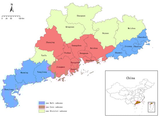 Guangdong is a coastal province located in South China known for its advancements in manufacturing and industry. Guangdong province consists of 21 municipal prefectures and can be divided into three functional zones according to the “one Core, one Belt and one District” regional coordinated development strategy proposed by the provincial government in 2019, based on the current development status and regional characteristics of each prefecture [36]. The ‘one Core’ functions as the core area for the economic and technological development of Guangdong province; it includes Guangzhou, Shenzhen, Dongguan, Foshan, Zhongshan, Zhuhai, Huizhou, Jiangmen, and Zhaoqing. This subzone forms the PRD, a world-famous processing and manufacturing hub with a high economy level that relies heavily on exogenous investment [37]. The ‘one Belt’ acts as the coastal district with advantages in commercial and industrial activity; it consists of Shanwei, Jieyang, Shantou, Chaozhou, and Zhanjiang, and Maoming, and Yangjiang, which are located in the eastern and western wings of Guangdong, respectively. The ‘one District’ is mainly responsible for the ecological remediation and natural resources preservation of the province; it includes Yunfu, Qingyuan, Shaoguan, Heyuan, and Meizhou in northern Guangdong, with a relatively under-developed condition. The heterogeneity in its development level makes Guangdong a suitable case for imbalanced development exploration. The geographic location and subzone division are presented in Figure 1.