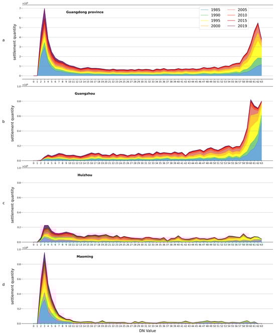The settlement distribution based on the NTL intensity at the provincial level is positioned at the top of Figure 2, marked as Figure 2a. The peaks at both ends of Figure 2a indicate that the settlements in Guangdong province are predominantly concentrated in areas with DN = 2~10 and DN = 55~63. The increment between the annual lines of the two peaks show that settlement expansion occurred differently in the two regions. For the right peak, where the urban region is largely located, the fastest growth occurred between 1990 and 1995 (yellow area); then, the area with the above colors gradually shrinks, indicating a transformation from a slower pace for urban settlements after 1995 to near-stagnation after 2005. In contrast, for the left peak, where the rural region is largely located, a gradual increase persists even after 2005. The most significant gap in the left peak appears between 2015 and 2019. This phenomenon also occurs among prefectures, and we attribute the gap to the improved resolution of WSF2019, which enables the detection of previously undetected rural settlements, rather than providing evidence of rural revitalization post-2015.