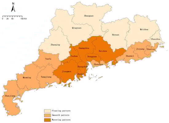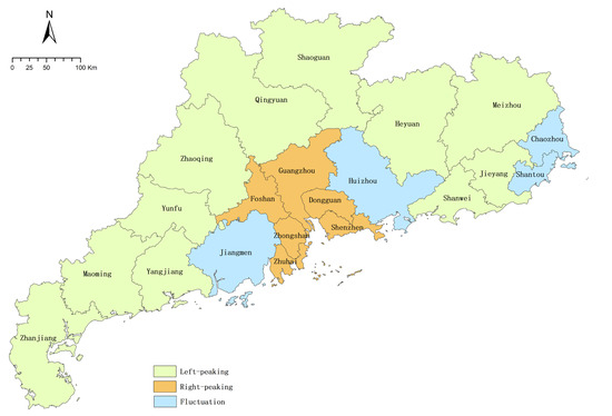 At the municipal level, prefectures are classified into three categories based on their histogram form: left-peaking, right-peaking, and fluctuation. The representative prefecture of each category is demonstrated in Figure 2, below subplot (a). Figure 2b demonstrates the form of right-peaking, characteristic of economically advanced prefectures in the core PRD, including Guangzhou, Shenzhen, Dongguan, Foshan, Zhongshan, and Zhuhai. Right-peaking is a reasonable structure for prefectures with a high urbanization level, where most settlements concentrated in the urban areas emit high-intensity light, reflecting imbalanced expansion favoring the urban region. Figure 2c illustrates the form of fluctuation, the category that includes Jiangmen, Huizhou, Chaozhou, and Shantou. Here, settlements cluster at multiple DN values without dominant aggregation, indicating a relatively balanced distribution between the urban and rural settlements. Figure 2d shows the form of left-peaking, which comprises Zhanjiang, Maoming, Yangjiang, Yunfu, Zhaoqing, Qingyuan, Shaoguan, Heyuan, Meizhou, Jiayang, and Shanwei. The settlements in these prefectures are primarily located in areas with a low NTL intensity, with minimal presence in the high-intensity range. This pattern reflects inadequate high-intensity lighting around settlements, driving settlement expansion predominantly in the rural region. The location of the prefectures in each category are mapped in Figure 3.