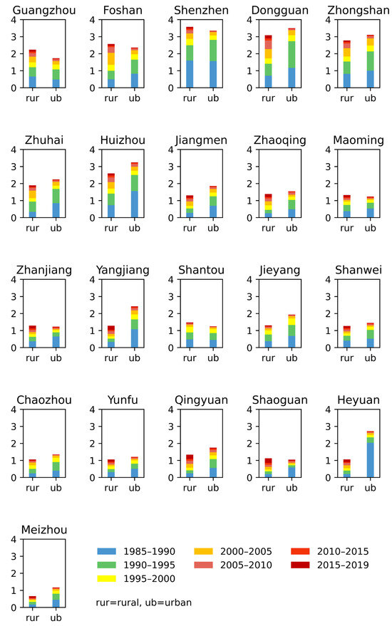 First, the spatiotemporal characteristics of the imbalanced settlement expansion in Guangdong province are analyzed by comparing the cumulative PER throughout the study period. The PER is evaluated using Equation (1) and visualized in Figure 4 using a stacked bar chart. Each colored section of the stacked bar represents the PER during a specific temporal period. A taller bar indicates that the cumulative PER for the corresponding region is greater than that of the other region. The comparison of the bar heights reveals that, for most prefectures, the cumulative PER of the urban region exceeds that of the rural region, reflecting the dominance of the expansion rate of urban settlements in the spatial dimension. The prefectures with higher bars for rural regions include Guangzhou, Shenzhen, Foshan, Zhanjiang, Maoming, Shaoguan, and Shantou. The first three prefectures are highly urbanized with limited space for further settlement expansion, explaining the faster expansion of rural settlements. Notably, Zhanjiang, Maoming, Shaoguan, and Shantou are located in the western, northern, and eastern peripheries of Guangdong province, respectively. We believe that this spatial pattern suggests a shift in settlement expansion away from the provincial economic center.