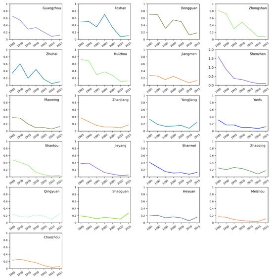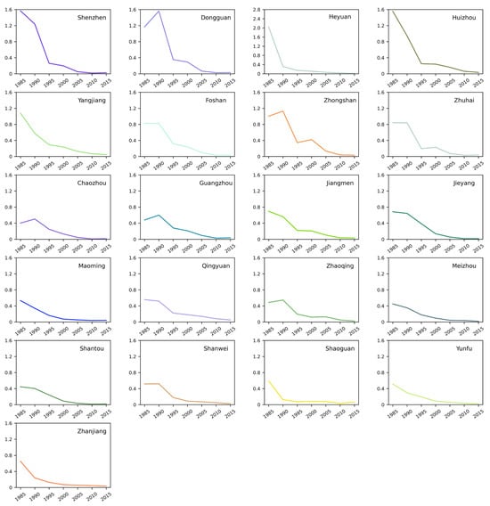 The PER dynamics for urban settlements at the municipal level are illustrated in Figure 7. For the urban region, two distinct patterns are identified based on the dynamics of the PER. The fist pattern features a sharp decline before 1995, followed by a gradual decrease. Prefectures exhibiting this trend include Shenzhen, Dongguan, Heyuan, Huizhou, Yangjiang, Foshan, Zhongshan, and Zhuhai. An initial PER greater than 0.8 is the classification criterion. The rest of the prefectures are categorized into the second pattern, characterized by a relatively steady decline in the PER throughout the study period. A high PER during the first temporal stage does not necessarily equate to a high settlement number, as the initial quantity also matters. For example, Heyuan’s high PER in the first temporal stage is attributed to the extremely low urban settlement number in that period.