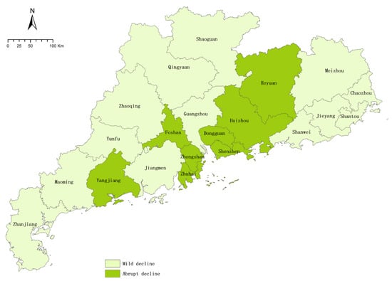The expansion patterns for the urban settlements are mapped in Figure 8. The prefectures with a greater expansion rate before 1995 are mainly concentrated around the PRD region, indicating urban settlement expansion is strongly influenced by regional economic conditions.