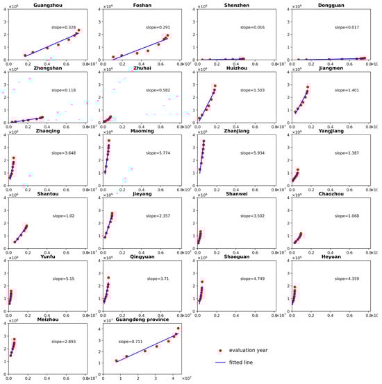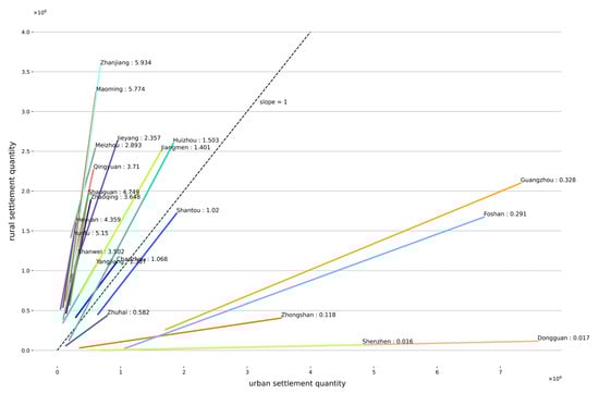 where and are, respectively, number of rural settlements and urban settlements of same year, and and are the intercept and slope of the linear regression model. The slope describes the quantity ratio of rural settlements to urban settlements. A ratio of 1 indicates equal urban–rural development in terms of settlement quantity, a smaller ratio indicates quantity dominance of urban settlements, and vice versa.