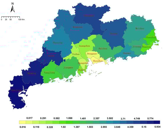 To comprehensively analyze urban–rural imbalance across Guangdong province, Figure 9 illustrates the expansion trajectories of urban and rural settlements for each prefecture over the study period. The red dots represent the eight evaluation years, with coordinates indicating the number of settlements in the urban and rural regions for each year. The blue trend lines represent the linear relationships. At the provincial level (last subplot of Figure 9), the slope indicates an initial advantage in the urban settlement number. However, the upward turn of the dots after 2005 suggests faster rural settlement growth, which is consistent with the findings in Section 4.2. At the municipal level, prefectures within the same functional zone and spatial proximity exhibit similar trends. The trend lines for most of the PRD prefectures incline horizontally, reflecting the quantity dominance of urban settlements. Shenzhen and Dongguan, with extremely low ratios, indicate that nearly all residents reside in high-intensity urban regions. The trend lines for the other prefectures incline vertically, indicating the quantity dominance of rural settlements. Compared to the finding in Section 4.2, the cumulative PER is greater in the urban region of most of the prefectures, revealing a contrast between the expansion speed and quantity. Most prefectures follow the provincial-level pattern, with the diminishing distances between dots indicating a slowdown in settlement expansion. Exceptions include Huizhou and Jiangmen (the second row), which exhibit relatively stable expansion over time. The slope values are mapped in Figure 10, revealing a radial pattern with the smallest values in the core PRD and increasing outward toward the peripheries.