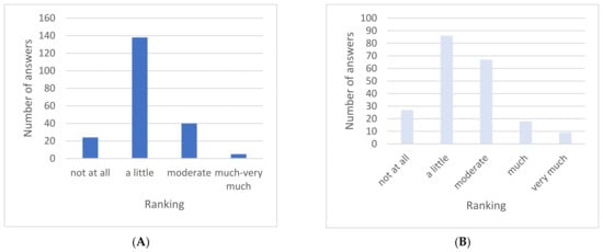 The answers are visualized in Figure 3. Respondents gave generally uniform answers in Part B, specifically on the application of CE in MSWM in their municipality. Regarding Question II1, “In your opinion, is your Municipality capable in MSWM?”, the responses were overwhelmingly lukewarm (“a little” was the most common response). In Question II2, “How much do you recycle?”, most replied “a little”, however, many also replied “to a moderate extent”. In Question II3, on how people in total recycle in your family, most answered “two people”, most probably the husband and wife, while in Question II4, “How much do you actively try reducing municipal waste generation?”, most respondents did not really consider reducing waste production in their everyday life. In Question II5, “Do you actively use recycled/reused products in everyday life?”, the answers mostly fell into the “a little” and “moderate” categories, while some respondents acknowledged that they were not actually aware of whether they performed this action or not. The general knowledge question (Question II6) on whether the respondents were familiar with the notion of CE, as described at the beginning of Part B, showed that they had some knowledge of this term (“moderate” was the most common answer), while some individuals were also very familiar with the term. The respondents also had a significantly high opinion of CE in terms of social advancement and environmental protection (Question II7). They also valued a lot the citizens’ contributions toward MSWM (Question II8), possibly through participatory planning, though not directly hypothesized. They did not believe that the municipality encourages this participation (Question II9), but some of them (45%) were aware of the mobile application Sense.City (https://sense.city/), which promotes participatory planning at the level of the municipality. In essence, the application helps the user to upload photos and report problems pertaining to municipal waste collection, roadworks, water and sewage collection systems, and the illumination of public spaces in real-time. Out of this percentage, 39% rarely used it, while 35% had never used it.