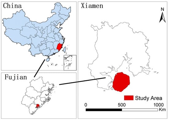 Xiamen City is located on the southeast coast of Fujian Province, at approximately 117°53′~118°26′ E and 24°23′~24°54′ N, and is an important node in the economic zone on the west coast of the Taiwan Strait and the Maritime Silk Road. The terrain is mainly composed of coastal plains, plateaus, and hills, with the terrain sloping from the northwest mountainous area to the southeast coastal area. Located in the global subtropical monsoon climate zone, it is also influenced by the oceanic climate, with warm and humid winters and hot and humid summers. The annual average temperature is around 21 degrees Celsius, with the lowest average temperature in January and the highest average temperature in August. The average annual rainfall is around 1200 mm, with the highest rainfall from May to August. The total land area of the region is 1699.39 km2, of which Xiamen Island has a land area of 132.5 km2. Xiamen Island, as the political and economic epicenter of Xiamen City, is not only highly urbanized with an advanced road system, but also notably exhibits a pronounced urban heat island effect (Figure 1). Being a key city in the southwestern Fujian economic zone, Xiamen has experienced rapid urbanization and significant landscape transformations over the past decades, which have exacerbated the urban heat island effect (UHI) and led to substantial thermal environmental stress [33,34]. The objective of this study is to devise a planning framework for the thermal environment of Xiamen based on landscape pattern metrics of urban green space. By incorporating digital elevation model (DEM) topographic maps and considering practical research requirements, areas such as mountains, water bodies, airports, and docks, which are infeasible for landscape pattern regulation, have been excluded.