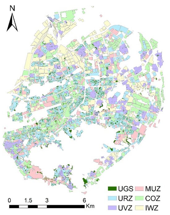 In this study, we obtained land use and cover data for Xiamen Island by interpreting high-resolution imagery from Google Earth. These images, with a spatial resolution of 0.14 m, were captured from 10 March to 14 November 2018. This period was chosen due to its clear weather conditions and minimal cloud cover, which are crucial for accurate land surface temperature (LST) data. This date also falls within the autumn season, a period of significant transition for the urban heat island (UHI) effect, allowing for a representative analysis of UHI dynamics. Additionally, the data quality and availability on this date made it suitable for the study. Based on the administrative boundaries of Xiamen Island, we precisely stitched and clipped the imagery. Subsequently, through meticulous visual interpretation, we exhaustively classified the land use and cover features depicted in the imagery. To ensure the accuracy of the classification, we randomly selected 200 sample points for accuracy assessment, which revealed a classification accuracy of 96%. In identifying urban functional zones (UFZs), this study particularly focused on urban road networks that may impede local heat dissipation, a concept originating from the research by Sun et al. in 2013 [35]. Considering the actual conditions and research objectives, we divided the interpretation results of remote sensing images according to socioeconomic functions and adjusted them in conjunction with digital elevation model (DEM) topographic maps, excluding mountainous areas, water bodies, and airports and docks, which do not participate in landscape pattern regulation. According to the research by Wang et al. (2025), land use types in Xiamen Island are categorized into five distinct urban functional zones: urban residential zones (URZs), urban village zones (UVZs), commercial zones (COZs), municipal public facilities zones (MUZs), and industrial and warehouse zones (IWZs) [36], Urban functional zones and urban green spaces are shown in Figure 2.