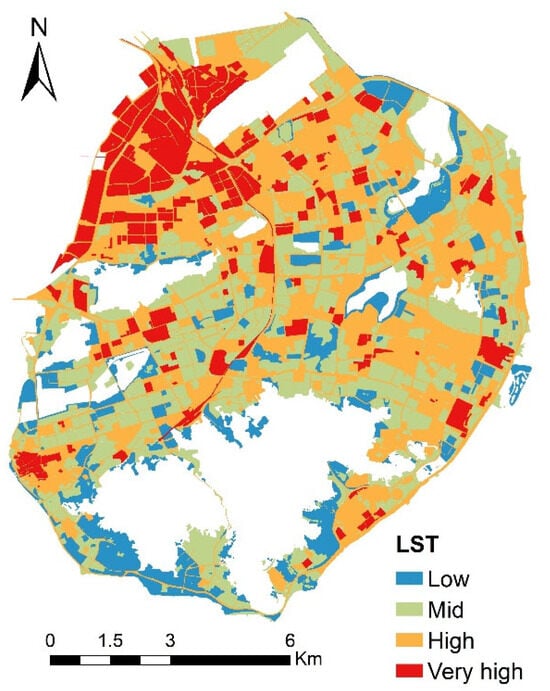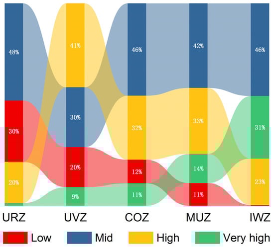 The land surface temperature (LST) in the study area is categorized into four classes using the Jenks natural breaks method: low temperature (30.18~34.93 °C), medium temperature (34.93~36.67 °C), high temperature (36.67~38.44 °C), and extremely high temperature (38.44~44.12 °C). Industrial and storage land in the northwest direction has higher temperatures, while parks, green spaces, and areas around water bodies have lower temperatures. The medium- and high-temperature zones account for 71.7% of the study area, with the low- and extremely high-temperature zones each comprising about 14% of the entire study area (Figure 3). Within each functional zone, the characteristics of temperature zoning differ; the area proportion of low-temperature zones gradually decreases, while that of extremely high-temperature zones gradually increases. The area proportion of low-temperature zones is the largest in the urban residential zone (URZ), accounting for 30.2% of the total area of URZ, and the area proportion of extremely high-temperature zones is the smallest in URZ, accounting for 1.4% of the total area of URZ. The area proportion of low-temperature zones is the smallest in the industrial and warehouse zone (IWZ), accounting for 0.4% of the total area of IWZ, and the area proportion of extremely high-temperature zones is the largest in IWZ, accounting for 30.9% of the total area of IWZ. The medium- and high-temperature zones remain the dominant areas in each functional zone (Figure 4).
