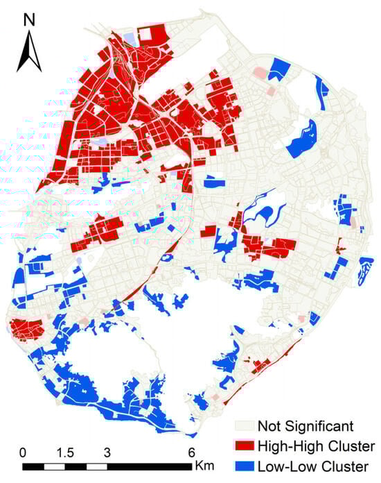 Figure 5 presents the Local Indicators of Spatial Association (LISA) cluster map for land surface temperature (LST) in the study area. The map highlights significant local spatial correlation patterns, primarily categorized into high–high and low–low clusters. High–high clusters (indicated in red) are areas where high LST values are surrounded by other high LST regions. These clusters are predominantly located in the northwest part of the study area, where industrial and storage lands are concentrated. This spatial pattern suggests that these regions experience elevated temperatures due to concentrated industrial activities and reduced green spaces. Conversely, low–low clusters (indicated in blue) represent areas with low LST values surrounded by other low LST regions. These clusters are mainly found around parks, green spaces, and water bodies in the southern part of the study area. The presence of these clusters indicates that these regions benefit from the cooling effects of green spaces and water bodies, resulting in lower surface temperatures. The spatial distribution of LST clusters reveals a clear divide between the northwest and southeast parts of the study area. The northwest exhibits a high–high cluster pattern, reflecting the impact of urbanization and industrial activities on the urban heat island (UHI) effect. In contrast, the southeast shows a low–low cluster pattern, highlighting the role of green spaces and water bodies in mitigating the UHI effect.