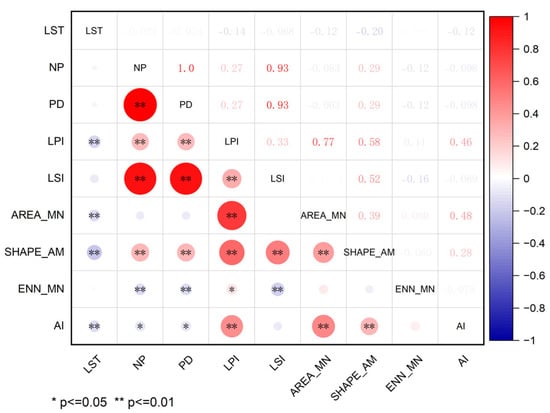 Through Pearson correlation analysis, we can clearly observe significant correlations between different landscape metrics and between LST and these landscape metrics. As shown in Figure 6, the correlations between LST and LPI, AREA_MN, SHAPE_AM, and AI are statistically significant at the 0.01 level. LPI is an indicator of the dominant patch types in the landscape, and its significant correlation with LST reveals the potential key role that dominant patch types may play in regulating the urban thermal environment. Furthermore, AREA_MN and SHAPE_AM are indicators reflecting patch area and shape complexity, and their significant correlations further highlight the potential importance of urban green space patterns in mitigating the urban heat island effect. The aggregation index (AI) examines the connectivity between patches of various landscape types; the smaller the value, the more fragmented the landscape.