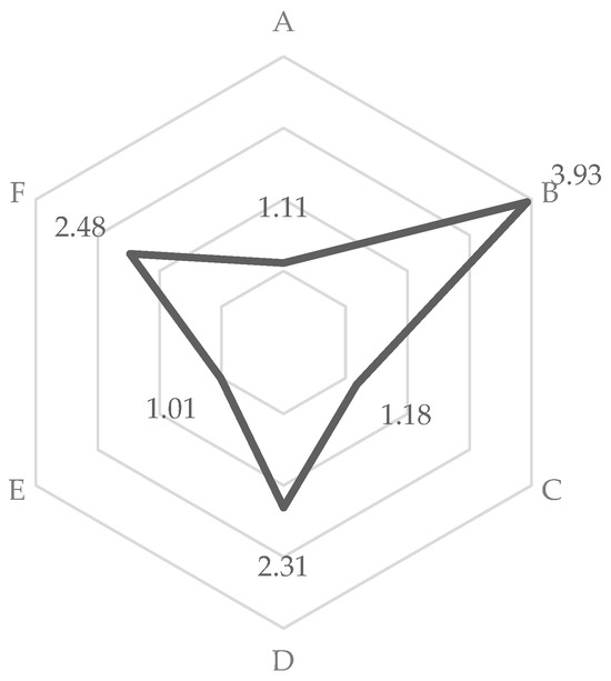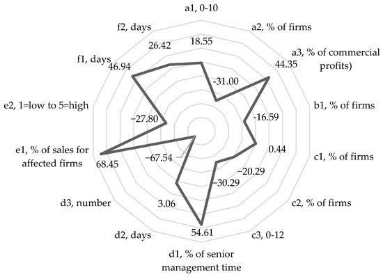 For the indicators for which a lower value is better (c1, c2, d1, d2, e1, f1, and f2), the direct average values/factual values ratio is calculated. All values that exceed 5 are set equal to 5 to avoid data distortion (when the values of specific indicators exceed other indicators’ values and ensure all the indicators’ compatibility). This allows for the accuracy of the evaluation to be increased and the model’s errors to be minimized. A polygon of competitiveness of corporate management in Eastern Europe is shown in Figure 1.