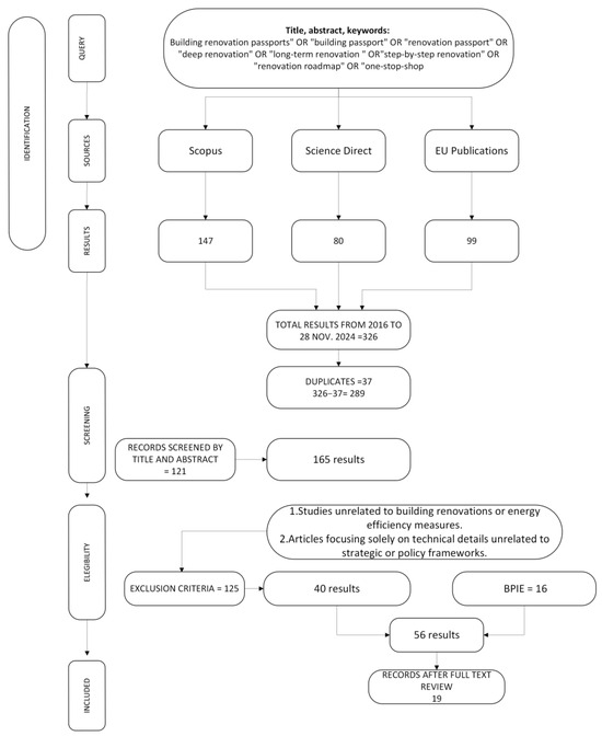 The initial research phase involved identifying relevant search terms and keywords for the review, carefully selected based on an analysis of the existing energy renovation literature. It became evident that focusing solely on “renovation passports” would not comprehensively understand the topic. Therefore, to enhance the breadth and sensitivity of the findings, additional related terms were included, such as “building renovation passports”, “building passports”, “renovation roadmap”, “step-by-step renovation”, and “long-term renovation”. These terms capture various aspects of structured renovation planning. Additionally, “deep renovation” was incorporated, as it aligns closely with the objectives of renovation passports by emphasising thorough, long-term improvements in energy efficiency and decarbonisation. This inclusion also provides a vision of how step-by-step renovation strategies can be effectively implemented.