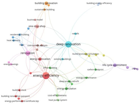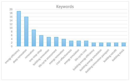 The top 15 keywords, ranked by frequency of occurrence, were selected and are visualised in Figure 4. The results reveal that certain research areas or keywords receive significant attention, while others remain underexplored. For instance, terms like “Energy efficiency”, “Deep renovation”, “One-stop shops”, and “Renovation” or “Building renovation” appear prominently, highlighting the growing focus on improving building energy efficiency. Conversely, terms such as “Building renovation passport” are noticeably less represented, indicating a gap in research attention to this concept.