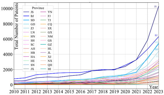 Total distribution of green technology innovation patents in China’s high-carbon manufacturing industries by provinces in 2023.