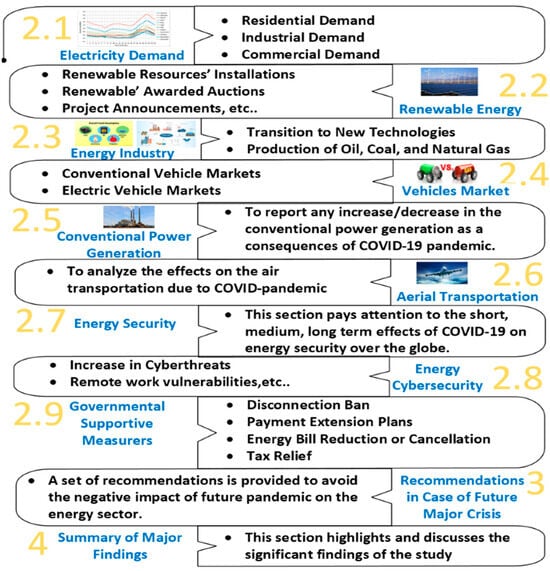 This taxonomy examines the multifaceted impact of the COVID-19 pandemic on global energy markets, analyzing its short-, medium-, and long-term effects across various sectors. It explores shifts in energy demand, the acceleration of renewable energy projects, the adoption of new technologies, and the evolving dynamics of the upstream energy industry (oil, coal, and natural gas). Additionally, it investigates market trends in electric vehicles (EVs) and internal combustion vehicles (ICVs), the transformation of the aerial transportation sector, and the growing emphasis on energy security and cybersecurity. The study also evaluates the supportive government initiatives implemented as countermeasures during the pandemic, providing a comprehensive roadmap for understanding the pandemic’s enduring impact on the global energy landscape. Figure 1 presents a visual overview of the taxonomy’s structure and content.