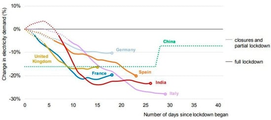 Reductions in electricity demand during the first weeks of the lockdowns [9].