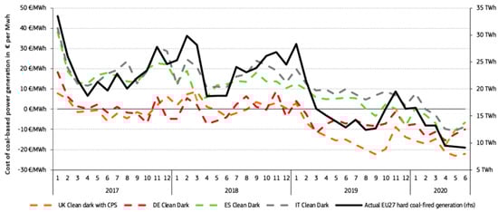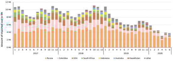 Despite being the world’s fourth-largest holder of coal reserves, India was forced to increase coal imports to meet its energy needs, further inflating global coal prices. Australian coal from the Newcastle mine, for instance, reached record highs of USD 240 per tonne [26]. In response to Asia’s coal supply shortages, Russia increased its coal exports by 43% [27], which had significant implications for Europe’s energy markets. During the second quarter of 2020, European coal imports had plummeted by 47% year-on-year to 10.6 million tonnes, reducing the import bill to EUR 0.75 billion, a 56% decline from the previous year, as shown in Figure 3 [28]. However, as Europe sought to secure energy supplies for the winter of 2021, the continent faced soaring gas and coal prices, with the European Power Benchmark averaging 105 EUR/MWh in Q3 2021—a 165% increase from the previous year. This price surge led to a temporary reversal of clean energy initiatives, as coal-fired power generation increased despite rising carbon prices. Nuclear power generation partially offset these emissions, with its share increasing by 28 TWh (around 20%) in the second half of 2021. Figure 4 highlights the trends in coal-based power generation from 2017 to 2020, illustrating the sector’s volatility during this period.