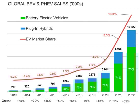 Global EV sales demonstrated remarkable resilience and growth during the COVID-19 pandemic, defying the challenges posed by supply chain disruptions and economic uncertainties. In 2022, 10.5 million new battery electric vehicles (BEVs) and plug-in hybrid electric vehicles (PHEVs) were delivered worldwide, representing a 55% increase compared to 2021 [41]. This growth underscores the accelerating global shift toward electrification, even as the broader automotive industry struggled with pandemic-related setbacks.