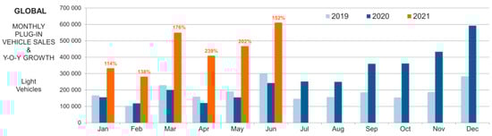 Compared with the conventional car market, the EV market performed better during the pandemic, losing only 15% during the first half of 2020, in comparison to a 42% reduction in the regular car market. Yet, not all EV markets witnessed drastic losses during the first half of 2020. Contrary to the global performance, the European EV market experienced unprecedented growth, where EV sales were 54% higher than pre-pandemic levels. Such amazing growth is largely due to the recent European policies that aimed to boost the acquisition of EVs, which contributed to the astonishing growth that continued even when economic conditions received multiple shocks at the peak of the pandemic [42]. Moreover, the EV market rebounded significantly, achieving five to eight times higher sales growth than regular car markets, reaching a total market share of nearly 5%. This has made 2020 a record-breaking and exceptional year toward achieving transportation electrification. Specifically, data show that nearly over 3 million EVs have been sold during the first half of 2021, constituting a staggering 175% increase from the total sales in 2020. Such resiliency in the EV market during the pandemic could be attributed to the low base of the first half of 2020 around the globe (apart from the European market), in addition to two main factors. The first is due to strong governmental support for green technologies, especially in Europe where tax rebates and consumer incentives were largely supported by governmental policies. The second is attributed to the continuous decline in battery cost coupled with innovative equipment manufacturers in both model choice and performance, which set the ground for exponential EV uptake.