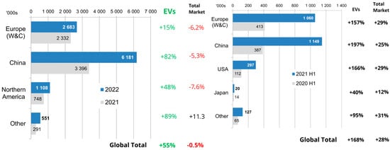 Regional disparities in EV sales growth were evident, reflecting varying market conditions and policy environments. In Europe, EV sales grew by a more modest 15%, constrained by weak overall vehicle markets and persistent component shortages exacerbated by the pandemic. In contrast, the United States and Canada saw a 48% increase in EV sales, despite an 8% decline in the overall light vehicle market. China, however, emerged as the standout performer, achieving an 82% surge in EV sales in 2022, as illustrated in Figure 5 and Figure 6 [41]. This exceptional growth highlights China’s dominant role in the global EV market, driven by strong government support, a robust manufacturing base, and increasing consumer demand for cleaner transportation options.