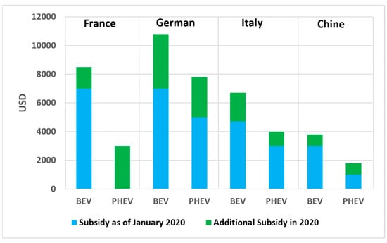 - IEA. National Subsidies for EV Purchase Before and After Economic Stimulus Measures; IEA: Paris, France, 2020; Available online: https://www.iea.org/data-and-statistics/charts/national-subsidies-for-ev-purchase-before-and-after-economic-stimulus-measures-2020 (accessed on 4 November 2024).