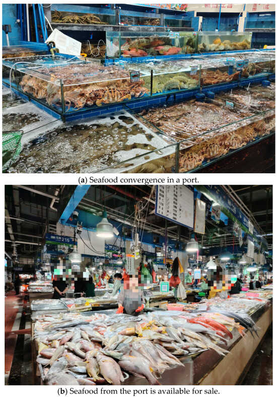 The Chinese standard “Logistics Terminology” (GB/T18354-2021) [23], which was published in August 2021 and implemented in December 2021, defines port seafood as logistics technology and organizational systems that keep goods, from production to consumption, at the required temperature according to the characteristics of the goods. For port seafood logistics, the national standard “Port Seafood Logistics Classification and Basic Requirements” defines it as using refrigeration technology as a means and freezing technology as the basis for keeping port seafood items in a constant-temperature environment from production to circulation, sales, customers, and other links so as to ensure the quality of port seafood items and reduce the loss of port seafood items. The port seafood logistics studied in this research refer to the logistics stage of port seafood products from the refrigerated distribution center to the point of demand.