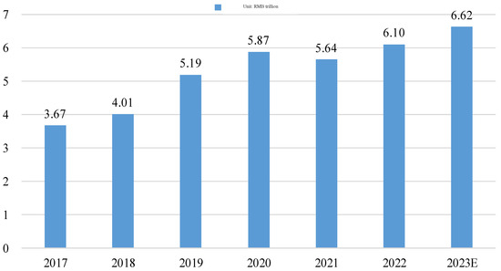 With its rapidly growing port seafood demand and improved infrastructure, China will become the most important contributor to the growth of the Asia–Pacific region, developing into a significant emerging market. China’s logistics industry is booming in emerging markets, not only taking advantage of China’s status as a factory for world goods but also benefiting from rapidly growing domestic demand [4]. The port seafood market size increased from CNY 3.67 trillion in 2017 to CNY 610 million in 2022, with an average annual compound growth rate of 9.21%. 2024E represents the forecast for 2024, which is expected to grow to CNY 6.62 trillion in 2024, as shown in Figure 2 [5].