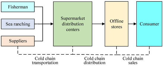 Compared to traditional farmers’ markets, large supermarket chains have a clean and comfortable shopping environment; the open, transparent, convenient, and fast one-stop shopping method can meet all the daily needs of residents and is more suitable for the fast-paced pace of contemporary life. Large supermarket chains generally have a more complete and excellent port seafood logistics supply system; relying on the demand for port seafood and agricultural products, they cooperate with suppliers, that is, fishermen or bases, and distribute port seafood and agricultural products to various offline stores of downstream supermarket chains with the help of specialized logistics partners, as shown in Figure 5. Port seafood supermarkets can better trace the source of port seafood products and ensure the quality and freshness of port seafood products, and more and more residents are more willing to go to large supermarket chains to buy port seafood products.