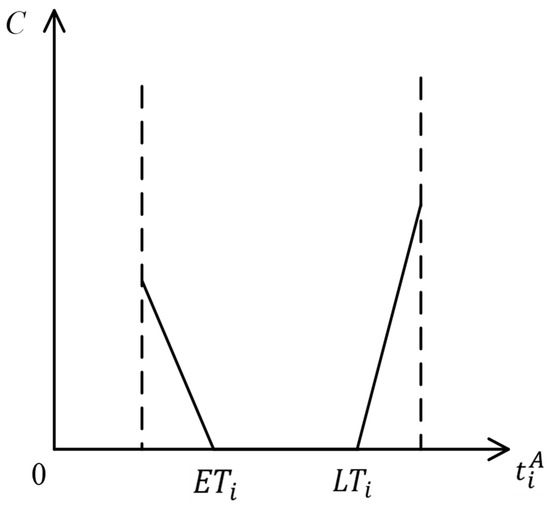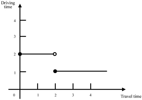 The Manlandraki time-dependent function indicates that the travel time of a vehicle between two points is related to the departure time of the vehicle. The time of day is segmented, and the travel time is described as a stepped function of the departure time, as shown in Figure 5. However, the model does not satisfy the First-In-First-Out (FIFO) rule, i.e., for the same stretch of route (), the vehicle that departs first does not necessarily arrive first. For example, if vehicle 1 departs at the time of 1.5, and the vehicle travel time is 2 according to the Manlandraki time-dependence function, then the vehicle arrives at the time of arrival 3.5. Vehicle 2 departs at the time 2, and according to the Manlandraki time-dependence function with the vehicle travel time 1, the vehicle arrival time is 3, which does not satisfy the FIFO rule.