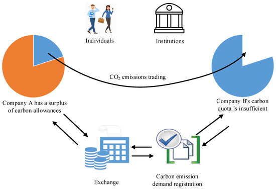 At present, the commonly used carbon emission reduction strategies are mainly carbon tax and carbon trading. A carbon tax is a tax levied on non-zero-carbon transportation to reduce the volume of non-zero-carbon transportation. The full name of carbon trading is “zero-carbon transportation rights trading”. The Kyoto Protocol adopted by the United Nations Intergovernmental Panel on Climate Change in December 1997 uses the market mechanism as a new way to solve the problem of reducing carbon dioxide greenhouse gas emissions; that is, the zero-carbon dioxide transportation allowance is traded as a commodity, which is called carbon trading, and the corresponding market is called the carbon market, and the carbon trading process is shown in Figure 6.