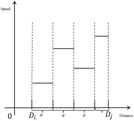 Step II: Calculate the travel time for each sub-segment. The time point at which the car leaves customer point is the starting time of the vehicle section ; then, the traffic congestion index is . The travel time for a subsegment with a distance of is = . The driving time of the -th sub-section is , and the driving time of each sub-section is shown in Figure 7. The start time of the second sub-segment is and the start of the third sub-segment is , …. The beginning moment of entering the -th sub-section is ;
