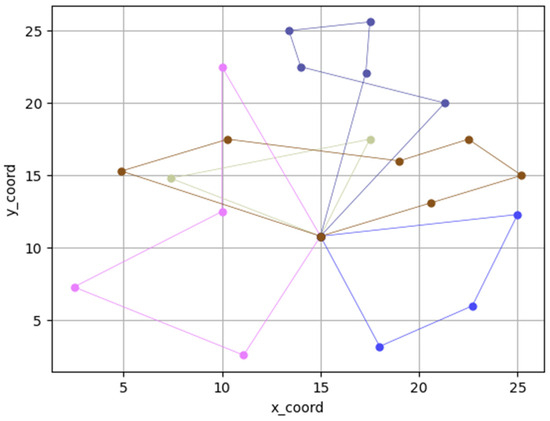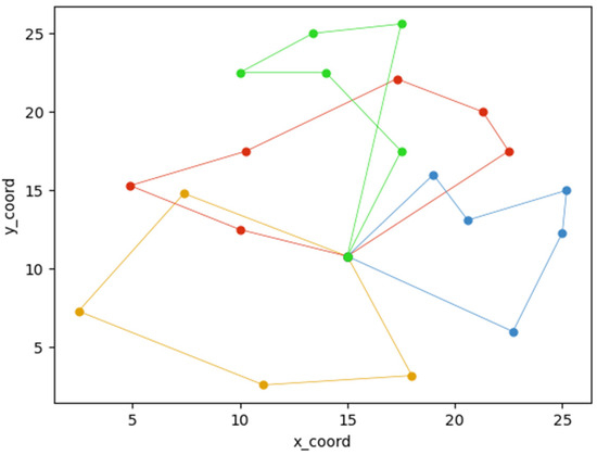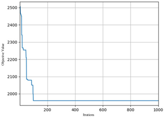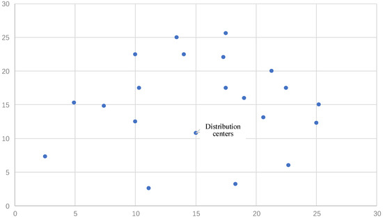 After the vehicle departs from the distribution center, it must pay a certain cost, , for vehicle use, including the driver’s salary, vehicle wear and tear, and maintenance costs. The cost of vehicle usage is usually constant, so the total cost of the vehicle usage can be expressed as Equation (9):