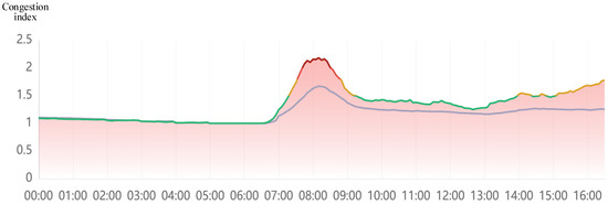 This article obtained real-time vehicle location, travel data, vehicle lanes, and other road traffic-related data through Baidu map-2025 software. The higher the traffic congestion index is, the higher the congestion level is. When the road is completely clear, we assume that the vehicle speed is , the congestion index of each road section is , and the vehicle travel speed in the sub-road section is constant. In the case of time-varying networks, the congestion period of urban roads is known due to the prediction of big data. Vehicles may be in the same lane partly in the open and partly in the congested period. We divide the road section and solve for the actual travel time of the vehicle. The specific steps are as follows: